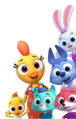 со своей семьей — мамой Курочкой Коко, Папой Петухом и братиком Цыплёнком Ми.